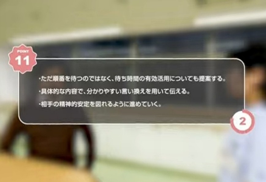 本コンテンツは、看護師が患者と接する中で実際に発生した事例を元に作成しており、患者対応の心構えなどに関するアドバイスも表示され、カスハラを疑似体験しながら、適切な対応について学ぶことができます。